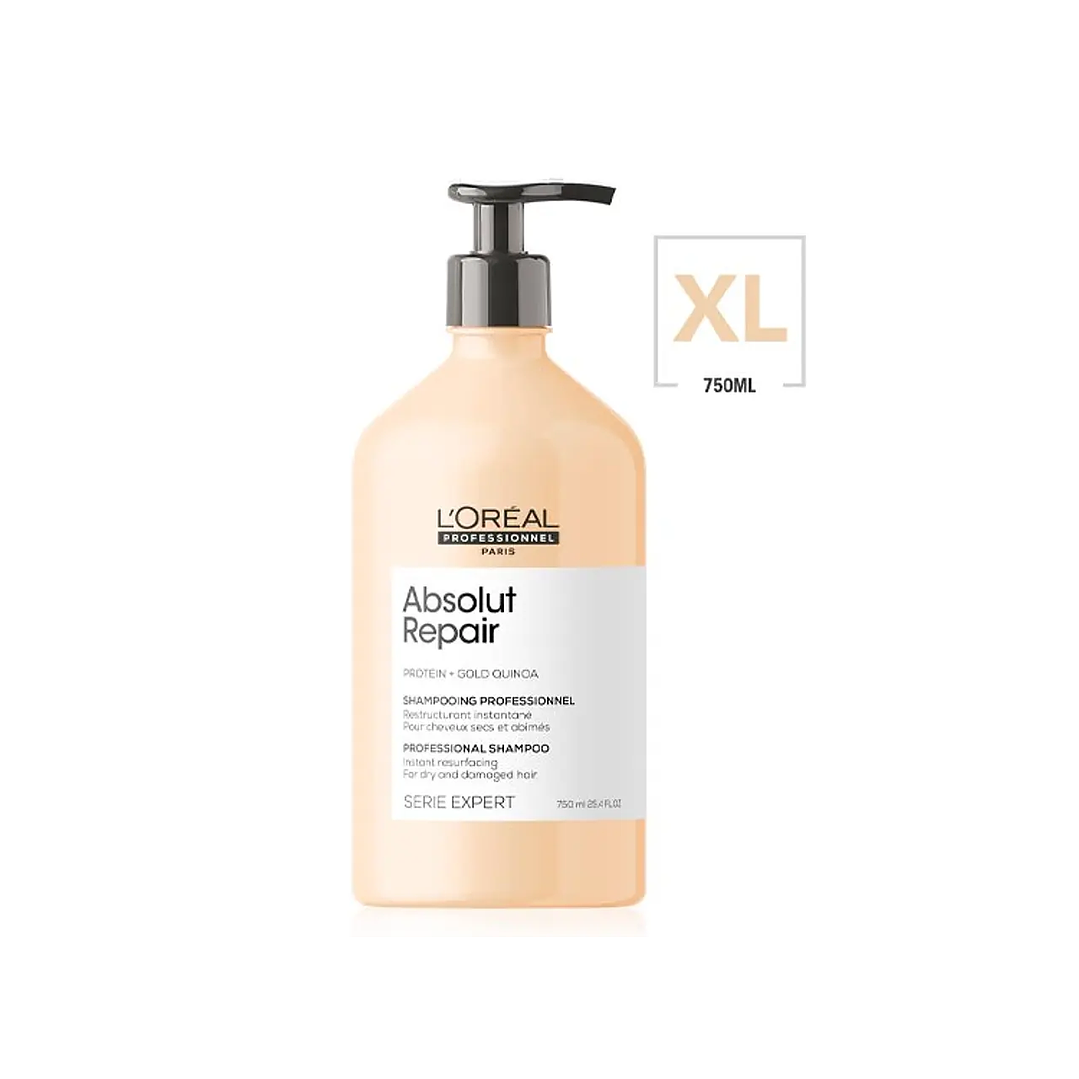 L'Oréal Professionnel Série Expert Absolut Repair Shampoo es un champú rejuvenecedor que trabajará tanto en el tallo del cabello como en la superficie del cabello para devolverle la vida al cabello dañado.