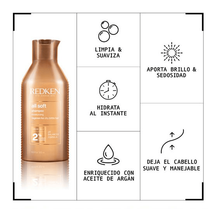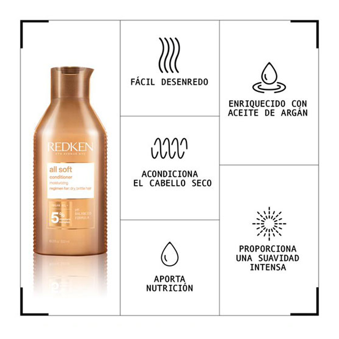 si buscas suavidad para tu cabello seco, el shampo y acondicionador ALL SOFT son los indicados para ti. Con su sistema de administración inteligente y exclusivo RCT protein complex tratan el cabello desde la raiz hasta las puntas, entregándole la nutrición personalizada que tu cabello necesita.
